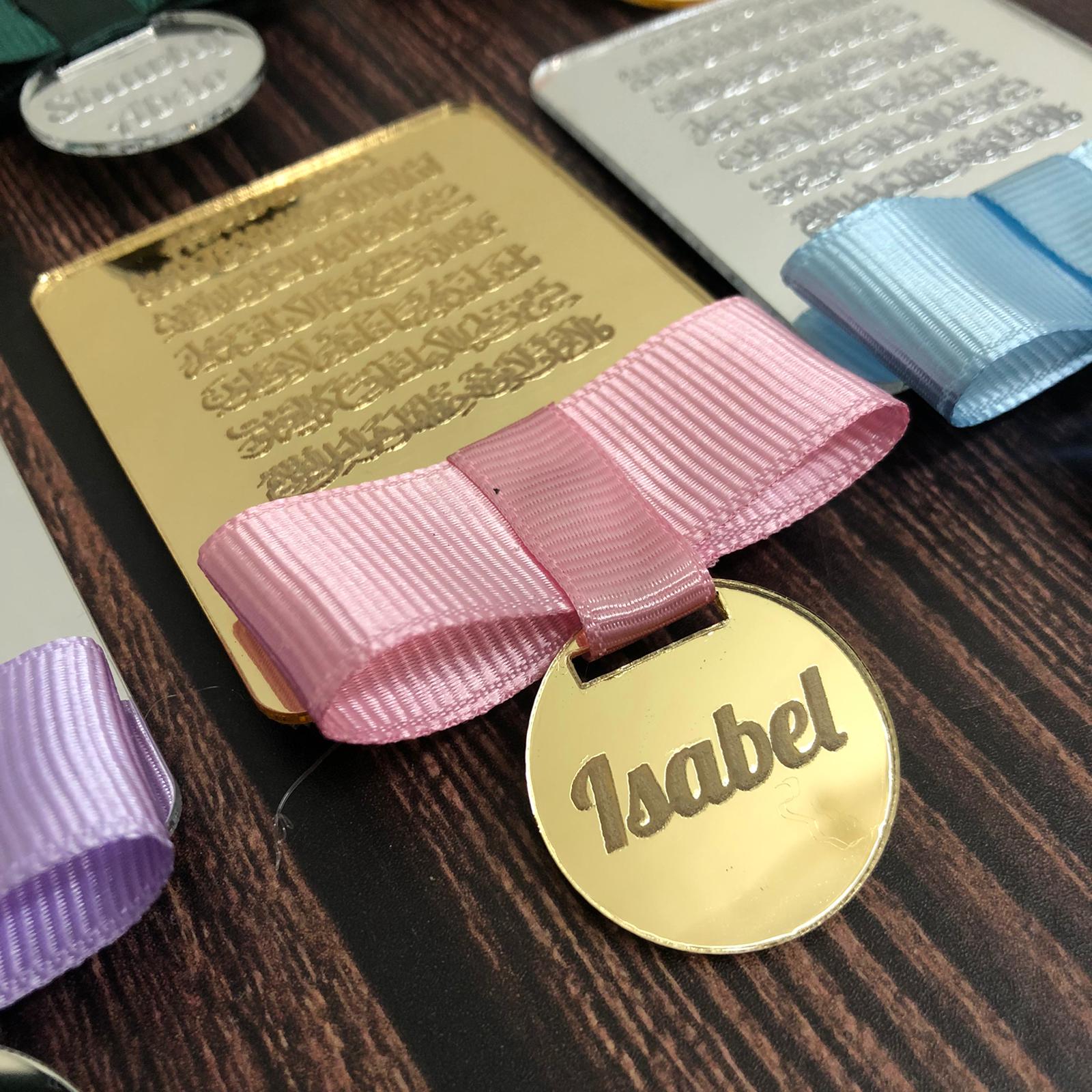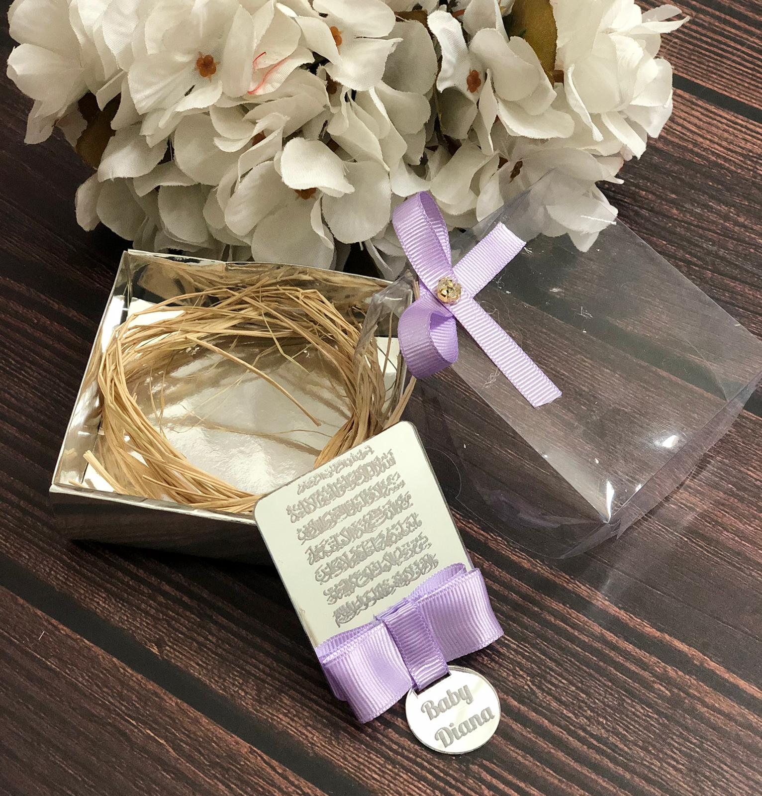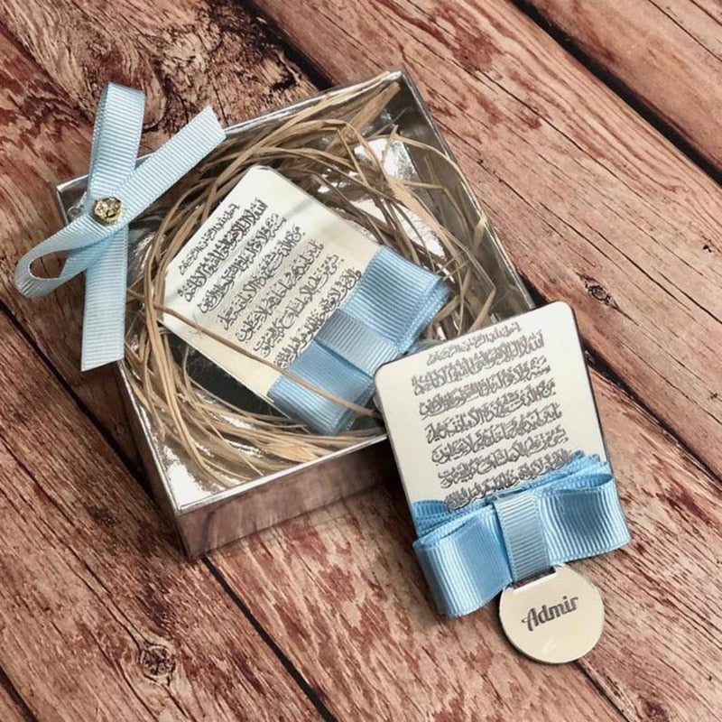 Każda ramka Ayatul Kursi ma wymiary 54x100 mm, idealnie pasując do dostarczonego pudełka o wymiarach 100x100 mm. W zależności od preferencji lustro może być przygotowane w kolorze złotym lub srebrnym. Możesz również wybrać kolor wstążki zdobiącej pudełko.