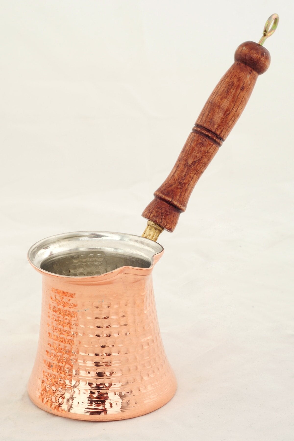 Details: Handmade engraved copper coffee pot with wooden pot spoon. Made with famous Turkish Copper in the Gaziantep City of Turkey by craftsmen with a century of experience in the copper industry. This pot's body is completely solid 2mm thick copper. Not lacquered. So it will develop a natural patina outside, as real copper should. Lined with food-safe lead-free tin. You can be assured this will last for many generations unlike other thin imitations found on Amazon. The coffee pot is made of the thickest copper available. Thus, it has maximum durability. Made by. (Amazon's best-selling Copper Bull Coffee Pots are made by, too).Capacity: 9 fl.Oz (270 ml) for 3 people. Diameter:3.5" Height: 2.8"GUARANTEED COPPER - AUTHENTICITY TEST: After receiving the pot, if for any reason you suspect that it is not copper, drill a hole anywhere on the pot's body and check the hole. You will see 2 mm thick copper along the hole. Nothing else. We will send you a replacement immediately if you decide to do this test and send us the photos afterward. (This test should be done within 7 days of receiving the pot to avoid abuse of the replacement guarantee).